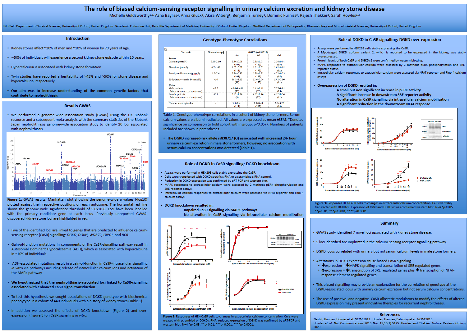 In a validation population, we demonstrated that genotype at the DGKD-associated locus correlated with urinary calcium excretion but not serum calcium concentration. In vitro studies demonstrated that knockdown and overexpression of DGKD resulted in biased CaSR-signalling. Thus, treatment of CaSR-expressing HEK cells with DGKD-targeted siRNA (DGKD-KD), resulted in decreased MAPK responses to alterations in extracellular calcium concentration [Ca2+]e, as assessed by SRE-reporter and ERK-phosphorylation (pERK) assays, when compared to cells treated with scrambled siRNA (WT) but without alteration in intracellular calcium responses [Ca2+]i as assessed by NFAT-reporter and Fluo-4 calcium assays (SRE maximal response DGKD-KD =5.28 fold change vs. WT=7.20 p=0.0065, pERK maximal response DGKD-KD=24.77, vs. WT= 39.46 fold change, p=0.0056). Conversely, DGKD overexpression (DGKD-OE) increased MAPK responses but suppressed [Ca2+]i responses to alterations in [Ca2+]e (SRE maximal response DGKD-OE =14.13 fold change vs. WT=9.06 fold change, p=0.01; NFAT maximal response DGKD-OE=13.67 fold change vs WT=59.16 fold change, p=0.0001).