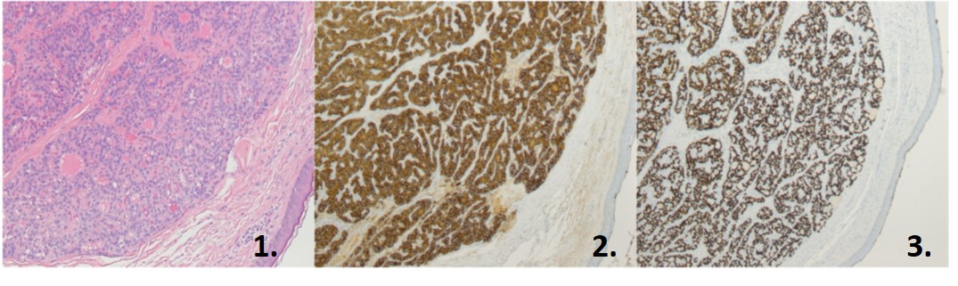 Vol. 2 No. 2 (2021)Figure 1: Intradermal deposit of thyroid tumour with follicular pattern. This tumour is not connected to the epidermis which raises a possibility of a metastasis. Figure 2: The tumour shows strong positivity for Thyroglobulin, which indicates thyroid origin and, in combination with morphological findings, points towards metastatic follicular carcinoma. Figure 3: The tumour shows strong positivity with TTF-1 indicating thyroid origin. (See Case Study by Roseman et al.)